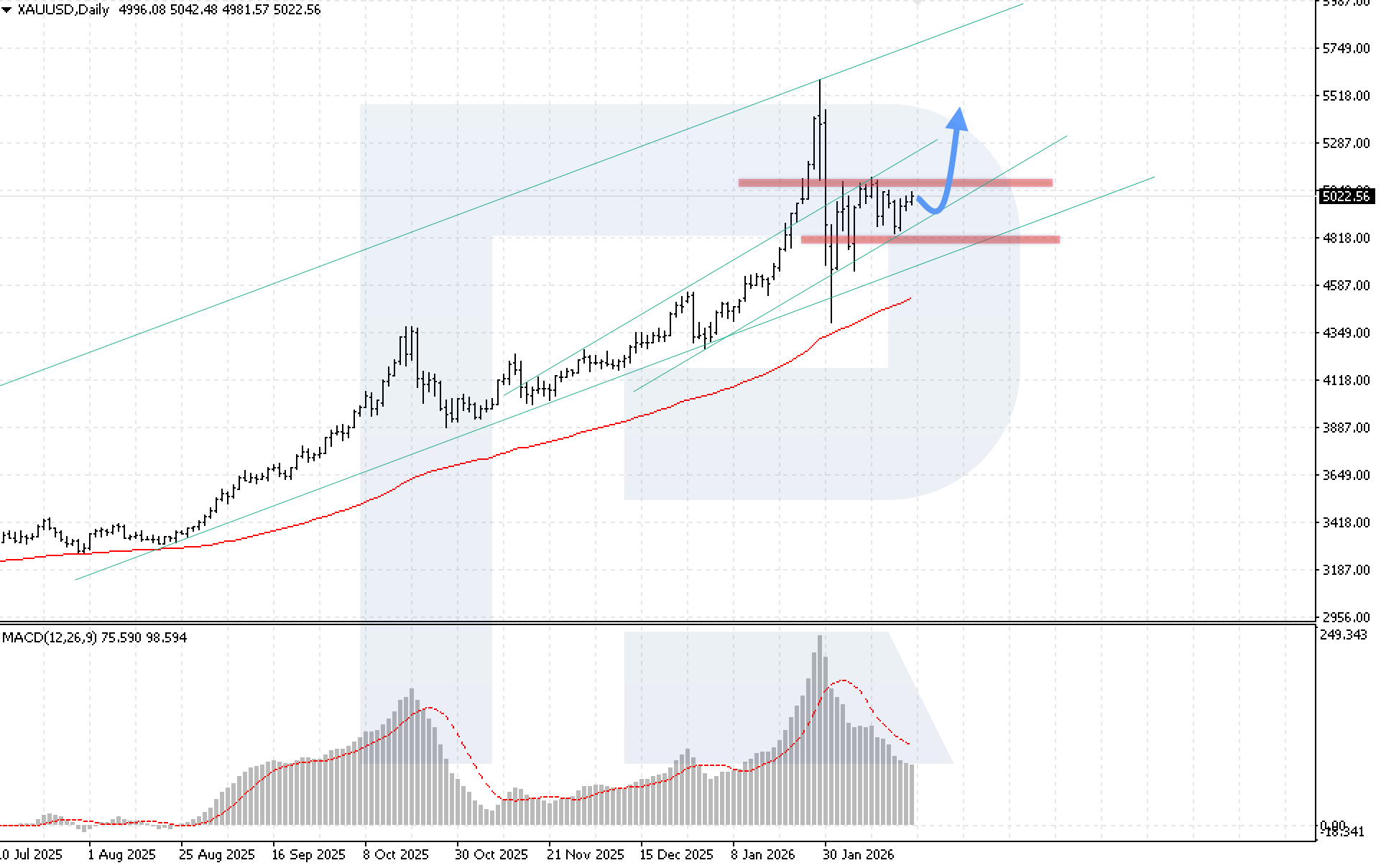 On the daily XAUUSD chart, prices continue to correct, but buying pressure is gradually increasing, and buyers still have a chance to test the key 5,105 USD resistance level. Renewed growth remains likely at the start of the week, with a potential target at 5,575 USD.