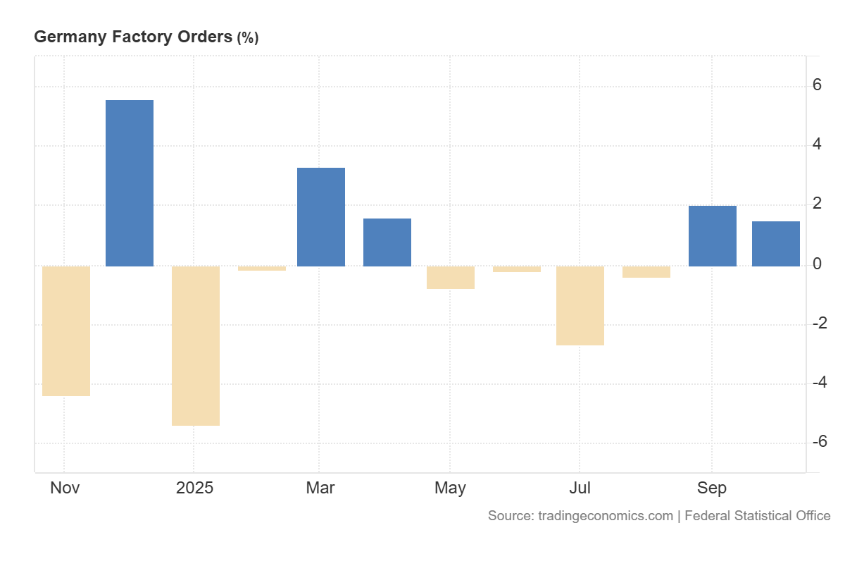 Factory orders in Germany increased by 1.5% m/m, far exceeding expectations of 0.3%, although slowing from the previous 2.0%. For the market, this is a signal that the industrial sector remains active: companies continue to receive new orders, meaning future revenue and capacity utilisation. The result is significantly better than forecast, so it is a positive surprise for the stock market, despite a slight slowdown compared to the previous month.
