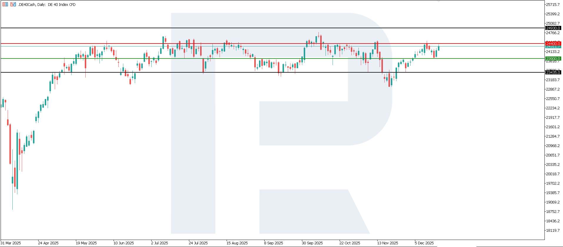 A stable interest rate maintains predictable financing conditions for companies and does not increase borrowing costs for businesses and households. This reduces the risk of a sharp slowdown in economic activity and supports equity valuations, especially in capital-intensive sectors. The DE 40 has a high share of export-oriented companies, so the dynamics of the euro play a key role. If the euro remains weak or weakens further after the decision, this supports the index through improved price competitiveness of German exporters.
