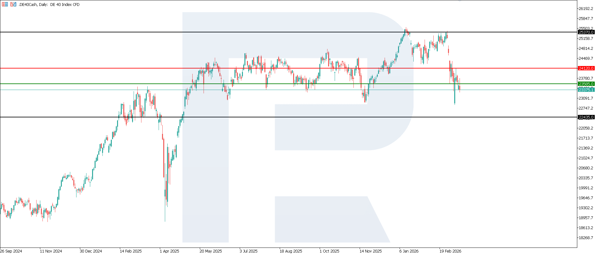 Based on the released statistics, the impact of this news on the DE 40 index will most likely be restrained and closer to neutral-to-positive. Germany’s monthly CPI increased by 0.2%, exactly in line with the forecast, while annual inflation in February came in at 1.9%, and the harmonised EU benchmark was 2.0%. In other words, the market did not get an inflation surprise. This is important for the stock market, as actual figures that match expectations typically do not provide a strong enough catalyst to trigger a broad rally or a sell-off in the index.