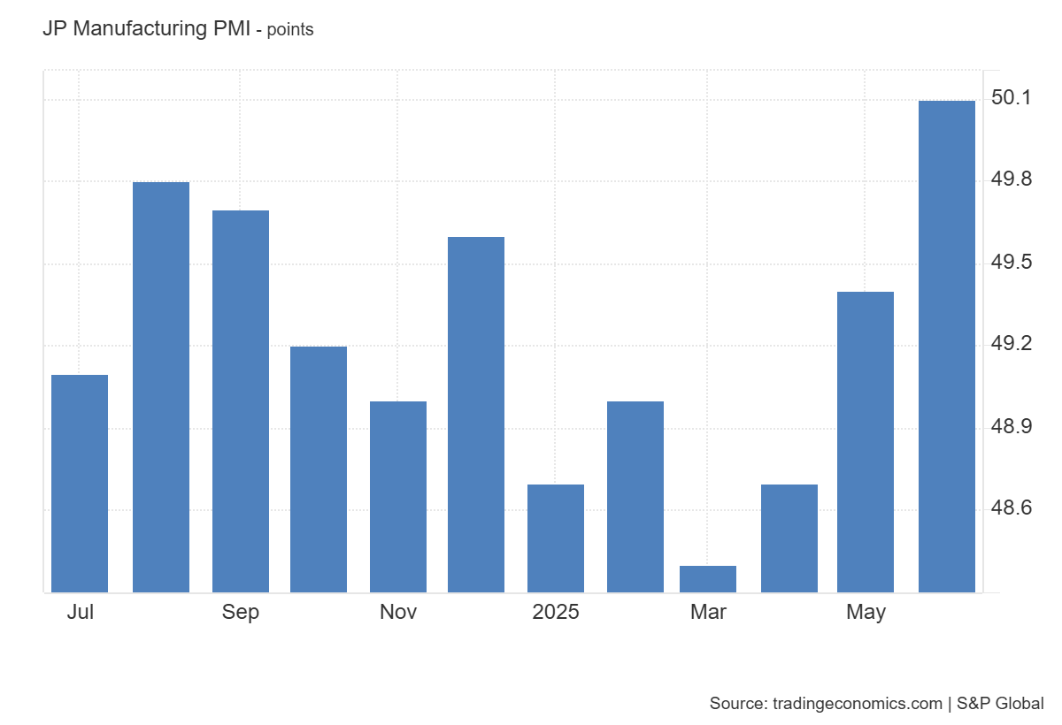 A Manufacturing PMI above 50 (current 50.1 vs previous 49.4) indicates a shift from contraction to growth in Japan's manufacturing sector, though growth remains minimal. This signals stabilisation and gradual recovery in industrial activity, which the market views positively. Recovery in manufacturing benefits the industrial sector, especially equipment and automobile producers.