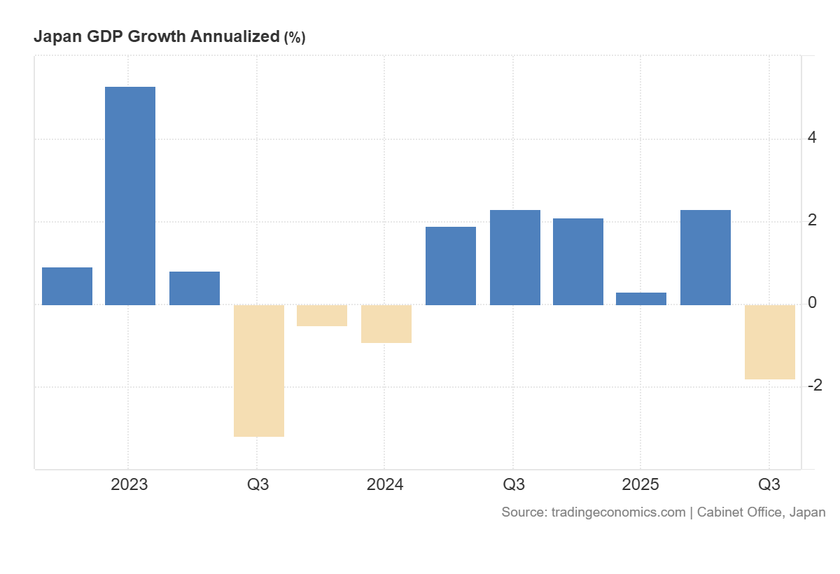 Japan’s annualised GDP indicator showed a decline of -1.8% versus the forecast of -2.5% and the previous growth of 2.3%. This means the economy shifted from expansion to contraction, although the downturn turned out to be less severe than analysts expected. Formally, this still signals cooling: companies on average produce and sell less than a year ago, and both domestic and external demand weakened. Such data is generally negative for the Japanese stock market because a weaker economy usually implies cautious consumer and business behaviour, slower investment activity, and pressure on company revenues, especially those focused on the domestic market.