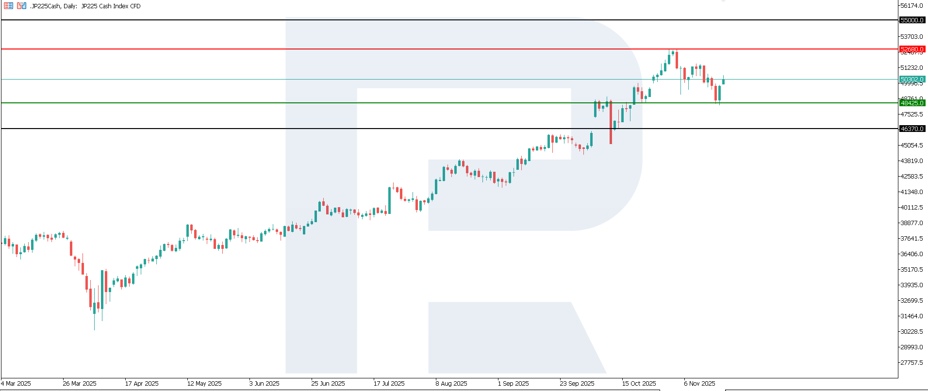 Japan’s GDP growth annualised: https://tradingeconomics.com/japan/gdp-growth-annualizedWithin the correction phase, the JP 225 rebounded from the 48,425.0 support level. Before resuming its rise, the index may trade sideways. The global trend remains upward. The resistance level has formed at 52,680.0. The nearest upside target stands at 55,000.0.