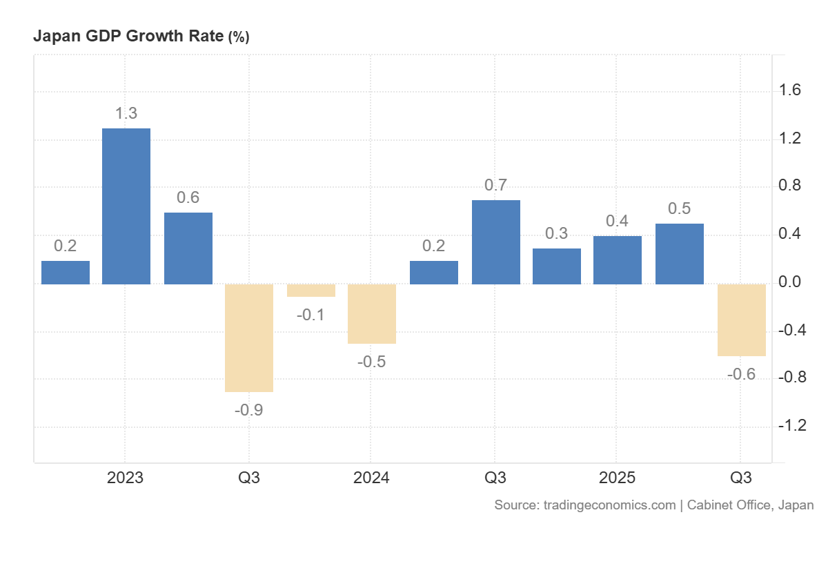 Japan’s GDP decreased by -0.6% quarter-on-quarter, which came in weaker than forecasts and significantly below the previous expansion. The result shows a clear slowdown in economic activity: consumer spending, investment and exports all weakened. This increases investors’ concerns about the pace of economic recovery and the resilience of corporate profits. For Japan’s equity market, such numbers act as a restraining factor. Market participants usually treat a weak GDP print as a signal of elevated risks for companies.