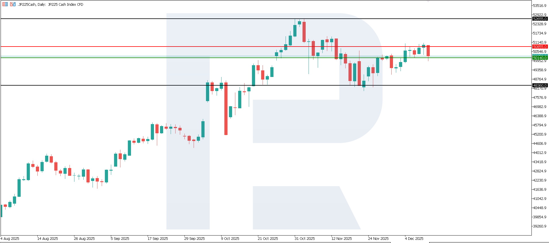 Japan GDP Growth Rate: https://tradingeconomics.com/japan/gdp-growthJP 225 continues to trade in an upwards trend. The support zone lies at 50,140.0, while the nearest resistance sits around 50,855.0. The narrowing range between these levels suggests accumulation by major market participants. The next growth target stands in the area of 52,655.0.