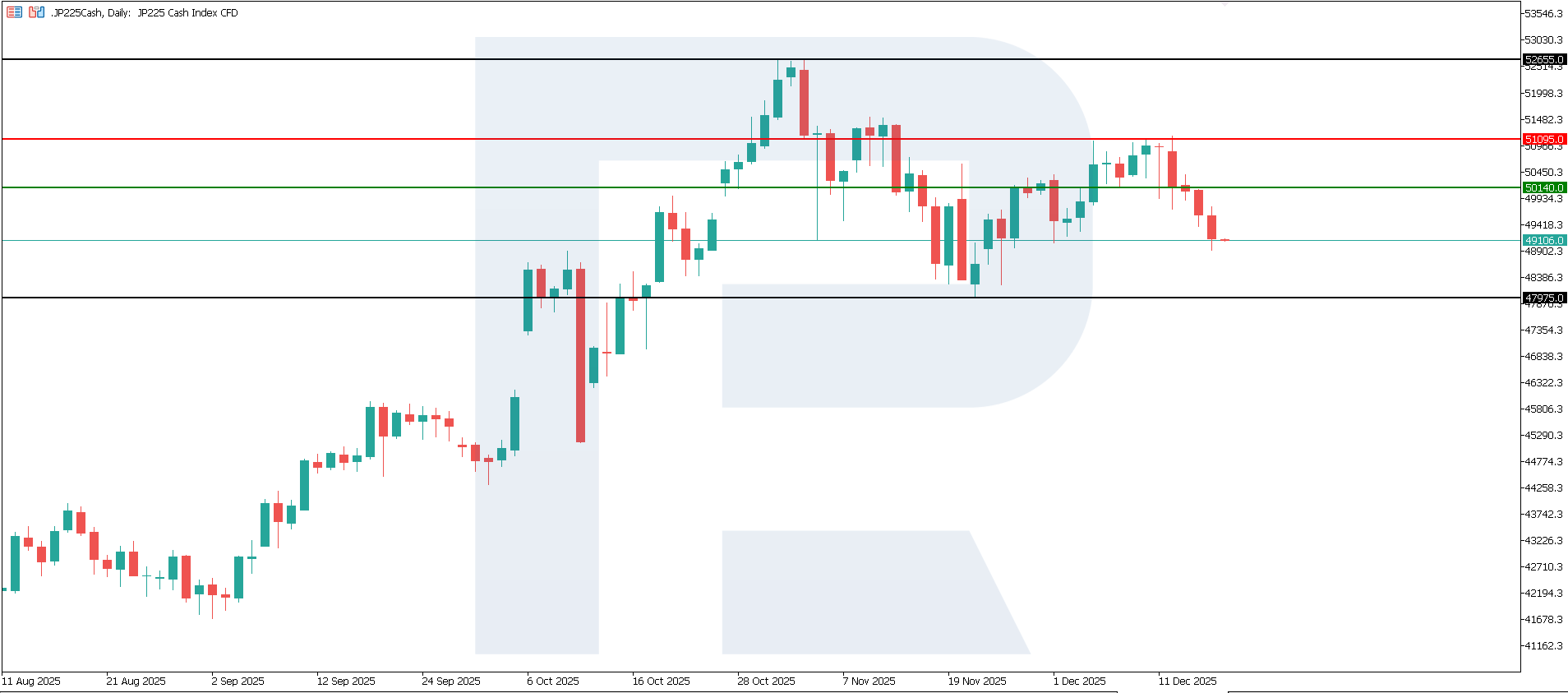 Japan Industrial Production MoM: https://tradingeconomics.com/japan/industrial-production-momThe JP 225 index trades in a downward trend. The support zone at 50,140.0 has been broken. The nearest resistance is located around 50,855.0. After the support break, the pace of the decline accelerated. The next potential downside target lies near 47,975.0.
