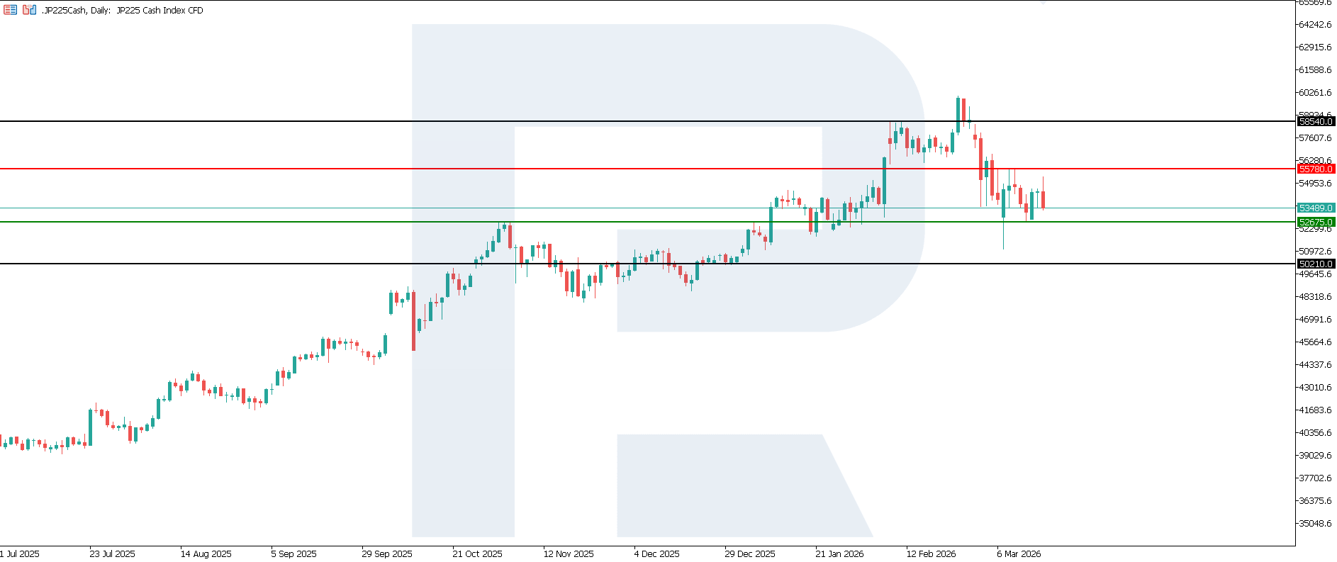 Japan’s balance of trade: https://tradingeconomics.com/japan/balance-of-tradeThe JP 225 index continued to decline and formed a downtrend. The key support zone is at 52,675.0, while the nearest resistance level has formed around 58,540.0. At this stage, it is difficult to estimate how long the current downtrend may last. The next downside target is seen at 50,210.0.