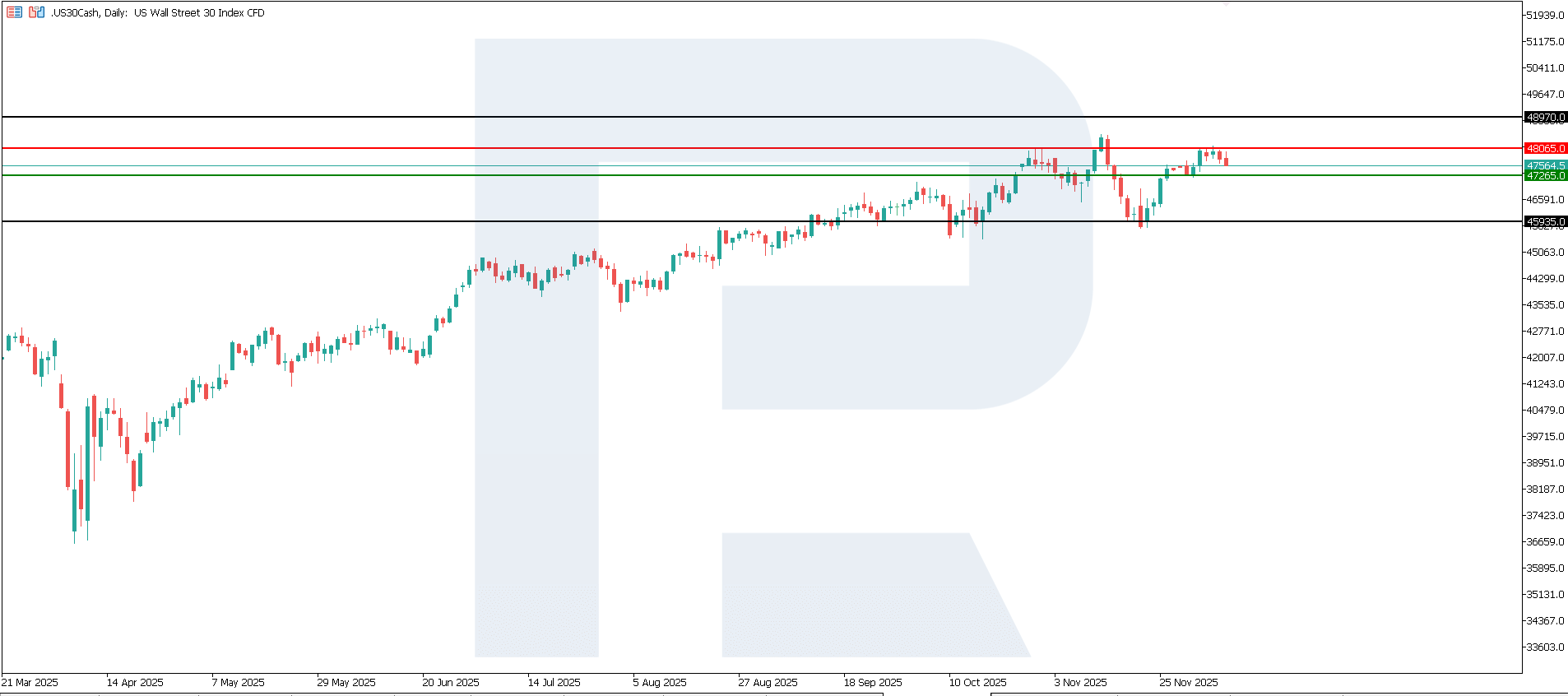 JOLTS job openings rose to 7.670 million, confirming the resilience of the US labour market. This supports the broader economy but reduces the likelihood of rapid Fed easing. For the US 30 index, the data is a moderately positive factor, as it strengthens the fundamental backdrop but does not provide a catalyst for a sharp rally. From a technical perspective, the index remains in an uptrend. As long as the support level is not broken, there is no indication of a trend reversal. The next upside target could be 48,970.0.