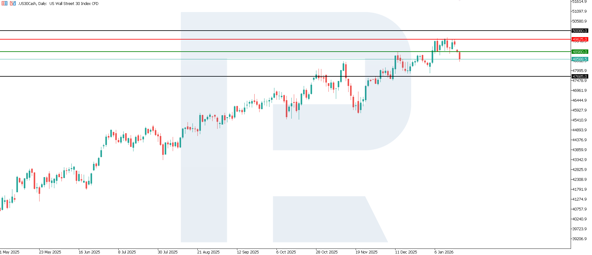 US industrial production at +0.4%, significantly above expectations, is a positive signal for US equities as it confirms resilient economic activity. For the US 30, the impact will likely be moderately supportive via its cyclical components, although upside potential may be partially capped by interest-rate market reactions. The nearest downside target could be 47,685.0.