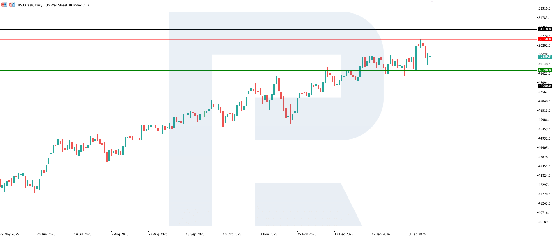 For the US 30 index, the current release supports a baseline scenario of gradual stabilisation rather than a sharp rally. The macroeconomic backdrop has improved as inflation moves towards the Federal Reserve’s 2% target, but confirmation of a sustained trend will require several consecutive releases. Therefore, the index’s further trajectory will likely be determined by a combination of upcoming inflation and labour market data, as well as the Fed’s commentary on interest rates. The nearest upside target could be 51,110.0.