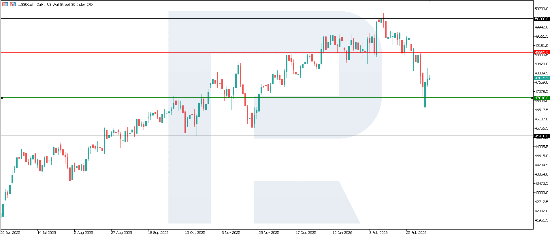 The US 30 index is undergoing a correction after a strong decline caused by the escalation of the military conflict in the Middle East. The US 30 forecast for today is negative.