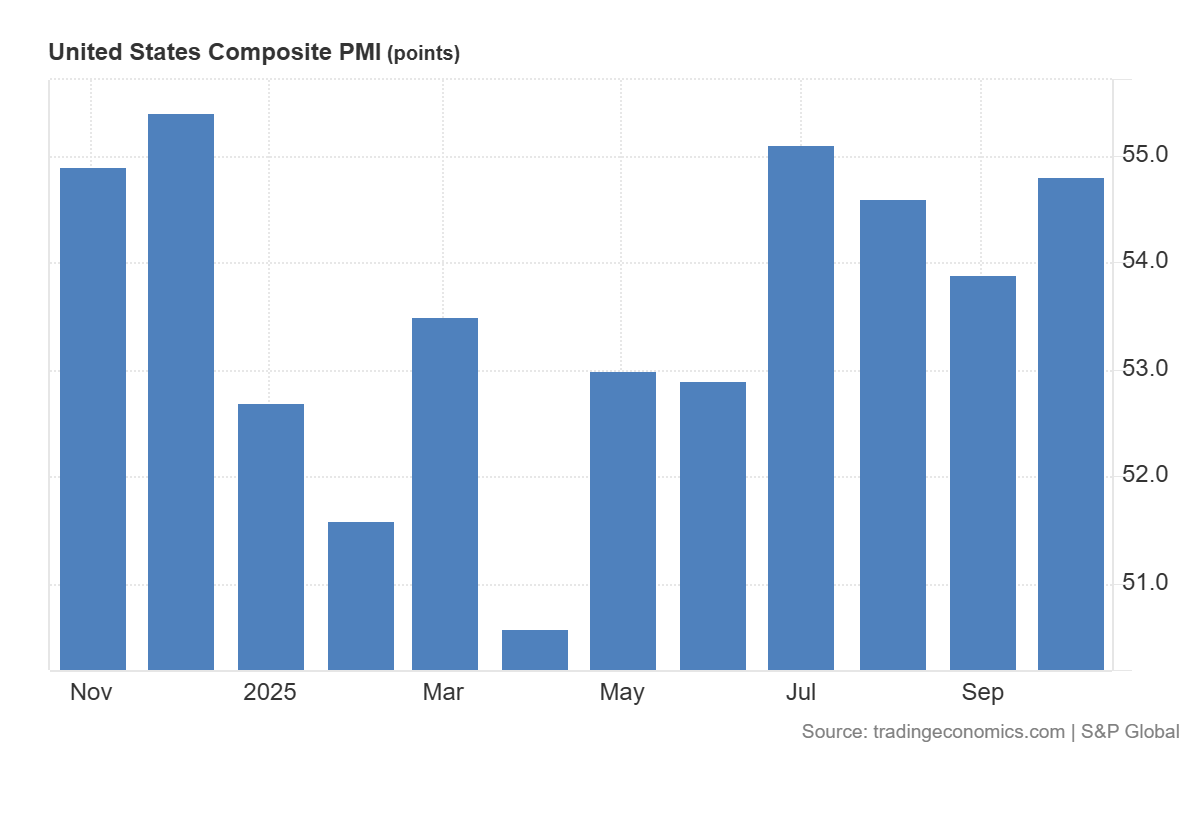 The U.S. S&P Global Composite PMI rose to 54.8, exceeding both the forecast (53.5) and the previous reading (53.9). This indicates an acceleration in overall economic activity across both manufacturing and services sectors.