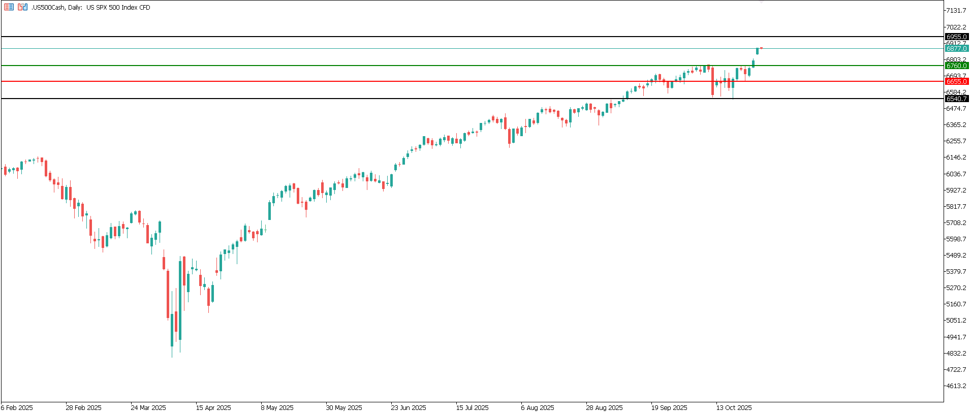 United States Composite PMI: https://tradingeconomics.com/united-states/composite-pmiThe US 500 index has renewed its all-time high for three consecutive sessions — marking the 34th record high this year. Support has formed at 6,655.0, while resistance at 6,760.0 has been broken, with a new resistance level yet to form. Prices continue to rise confidently, though a short-term correction without a trend reversal remains possible. The next potential upside target is near 6,955.0.