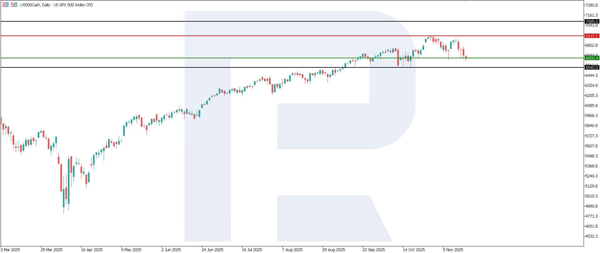 In the longer term, the impact of the shutdown’s end on the US 500 will depend on the eventual outcome of the budget conflict. If the compromise is stable and does not imply a renewed threat of another shutdown, the index may consolidate at higher levels as the risk of a repeat crisis decreases. However, if the agreement is temporary and debates over the debt ceiling and budget deficit quickly return, the market will treat the current end of the shutdown as a pause rather than a resolution. From a technical perspective, the US 500 index may fall to 6,540.0.