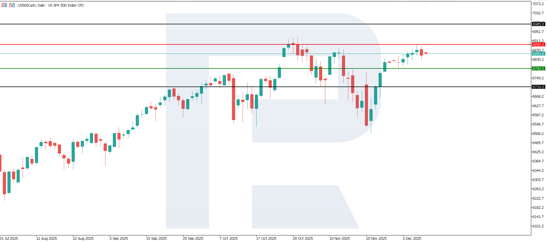 US core PCE price index annual change: https://tradingeconomics.com/united-states/core-pce-price-index-annual-changeThe US 500 index has formed a resistance level at 6,895.0 and a support level at 6,790.0. The uptrend is slowing as the index approaches a new all-time high, with a short-term correction likely. If the price fails to break below the support level, the uptrend will remain intact, with a potential upside target around 6,985.0.