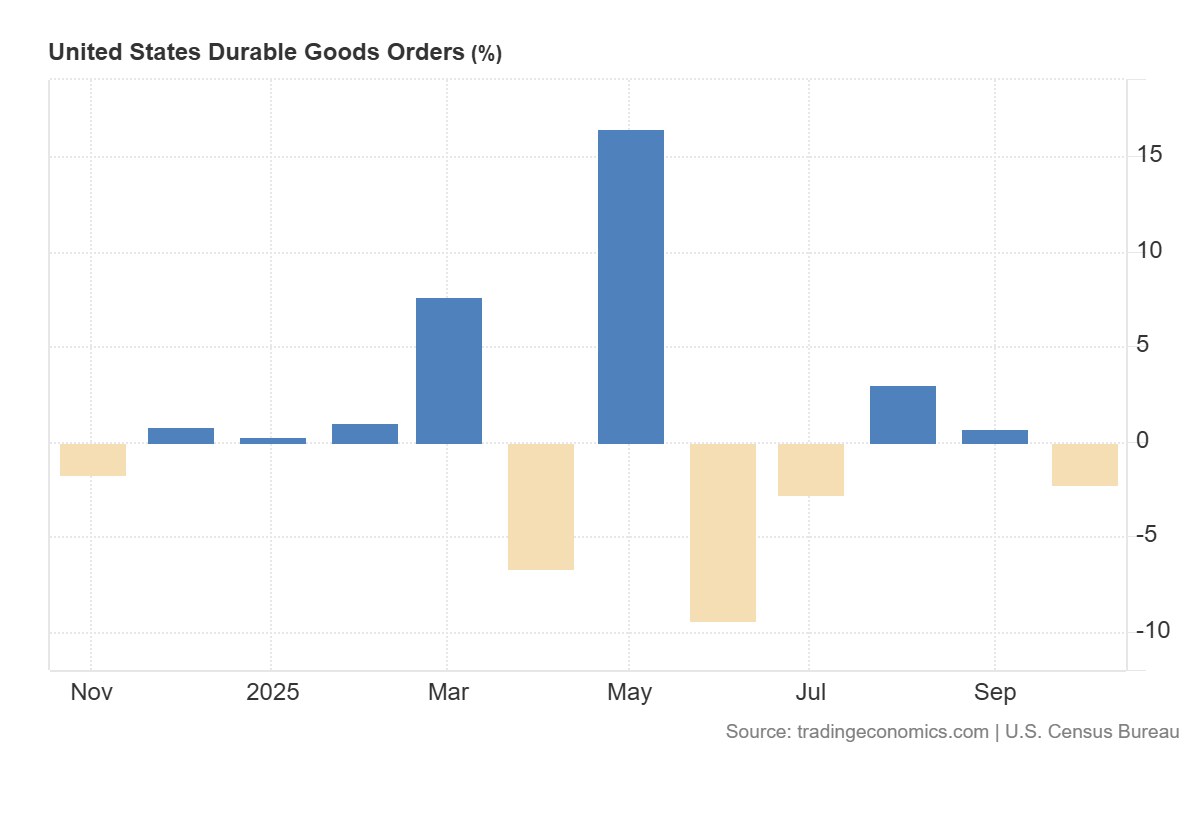 The indicator declined by -2.2% month-on-month, which came in worse than the forecast of -1.5% and significantly weaker than the previous reading of +0.7%. This dynamic points to cooling demand for capital-intensive goods and may signal a slowdown in corporate investment plans in the coming months. For the US equity market, this usually acts as a moderately negative signal, primarily for sectors that depend on the industrial cycle and business investment. Investors may factor in more restrained revenue growth for industrial companies and equipment suppliers, which reduces overall optimism.