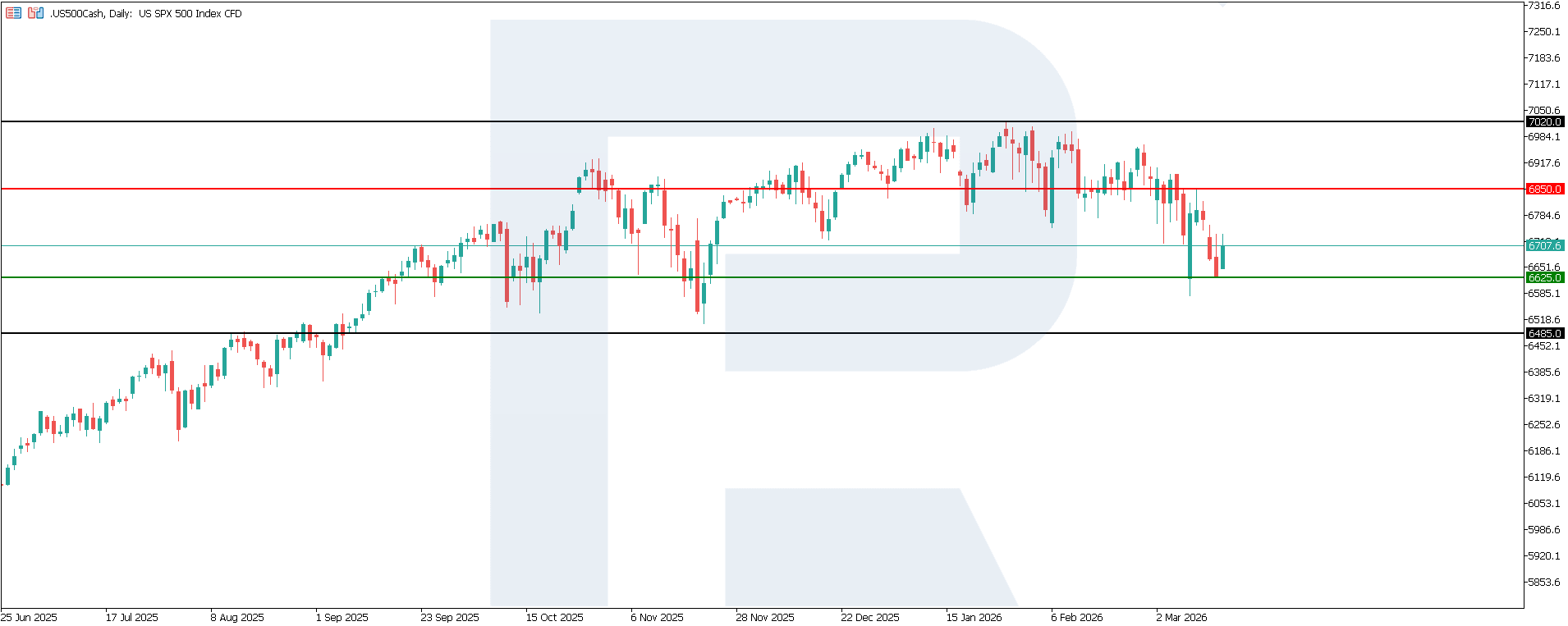 Overall, the latest data primarily signals a risk of a US economic slowdown for the US 500 index. The most vulnerable segments are industrials, financials, consumer cyclicals, and partly commodities-related sectors, while healthcare, utilities, and consumer staples may prove more resilient. The key question now is whether the market treats this as a temporary slowdown or the beginning of a deeper cooling in the economy – this will largely determine the scale of the next move. From a technical perspective, the US 500 index could fall to 6,485.0.