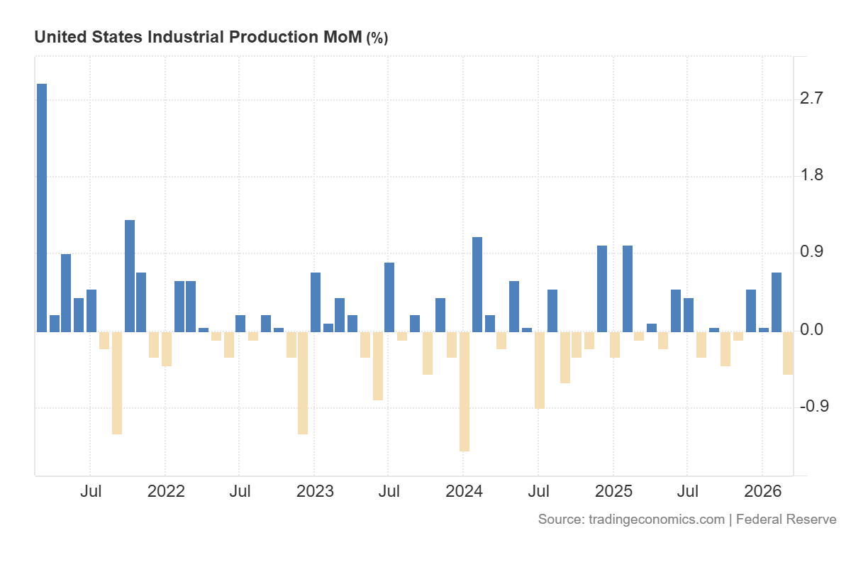 The US industrial production figures look negative for the US 500 index, as the actual reading was significantly worse than expected: a decline of 0.5% versus a forecast for a 0.1% increase. The downside is reinforced by the fact that the previous reading was +0.7%, suggesting the market is seeing not just a weak print, but a sharp shift from growth to contraction in industrial activity.