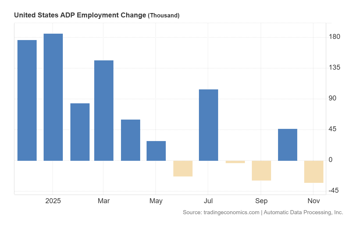 The ADP employment report came in significantly weaker than expected, with the private sector losing 32 thousand jobs instead of growing by 5 thousand, compared to 47 thousand added in the previous month. This is a sharp reversal and a signal that companies have become more cautious about hiring, while some industries are already implementing layoffs. For the market, this is an early warning sign: the data points to a noticeable cooling of the economy and could amplify discussions about risks of slowing growth or even a technical recession if similar dynamics appear in official payrolls.