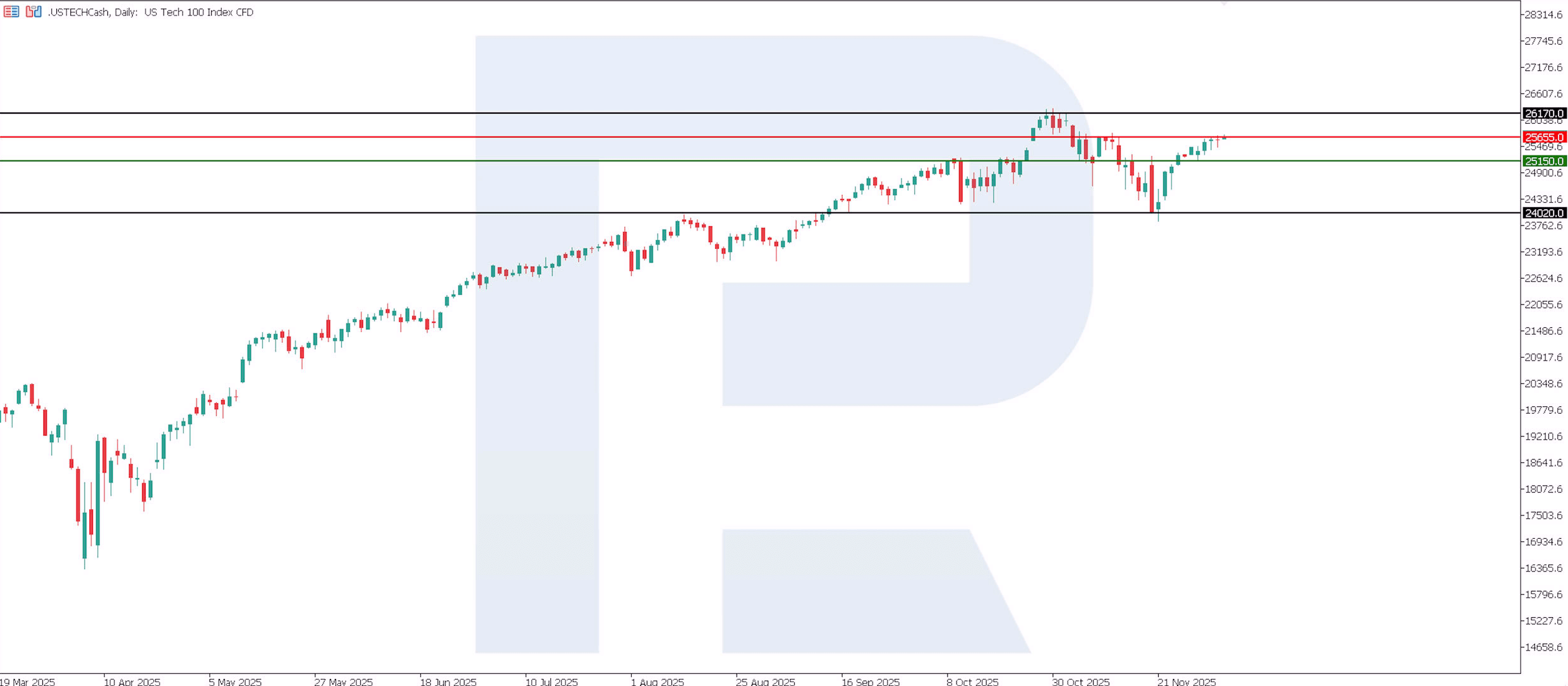 US Tech technical analysis for 5 December 2025The US Tech index has entered an uptrend, with the nearest resistance level at 25,655.0 and the support level at 25,150.0. An upside target could be the 26,170.0 level.
