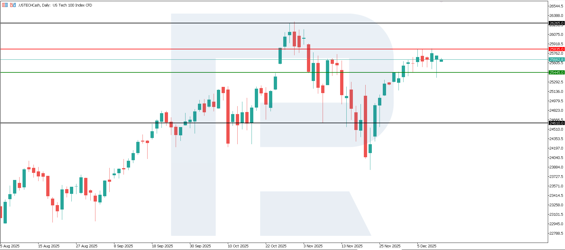 Overall, the Federal Reserve’s rate cut creates a supportive environment for the US equity market, particularly for the technology sector. The US Tech index receives a strong growth impulse, although further dynamics will depend on upcoming Fed commentary and expectations regarding the future rate path. From a technical standpoint, the upward trend appears medium-term in nature, with no clear signals of an imminent reversal. The nearest upside target remains 26,265.0.