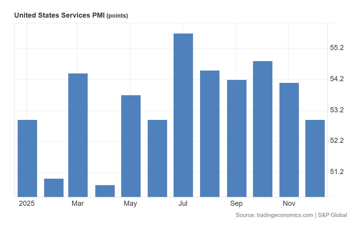 The U.S. Services PMI printed at 52.9, below expectations of 54.0 and down from 54.1 previously. Although the index remains above 50, indicating continued growth in the services sector, the pace of expansion has clearly slowed and turned out weaker than the market expected. This release matters for US equities because services represent the largest part of the US economy, including consumption, finance, logistics, IT services, healthcare, and other segments.