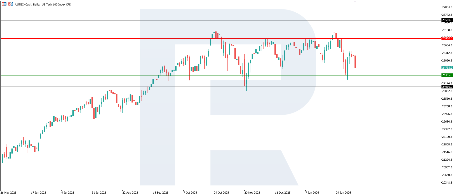 US Tech technical analysis for 13 February 2026The US Tech index entered a downtrend, with the nearest resistance level at 25,860.0 and the support level at 24,455.0. The correction has evolved into a downtrend, with the decline exceeding 6.5%. The downside target may be the 24,010.0 level.