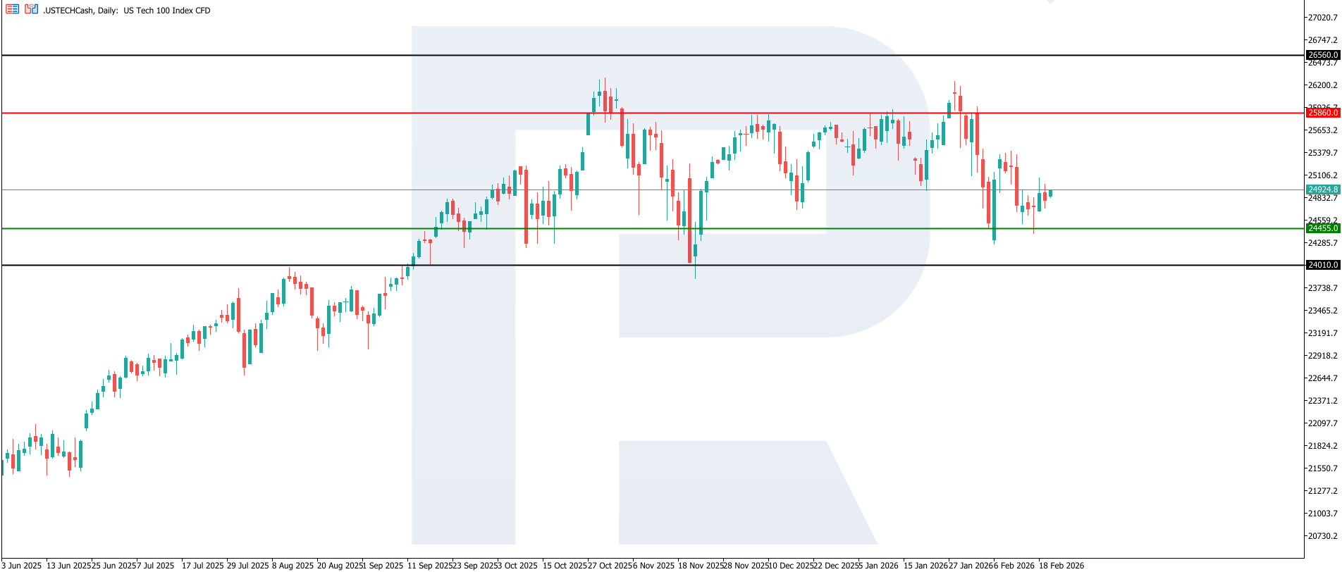 US Tech technical analysis for 20 February 2026The US Tech index entered a phase of downward momentum, with the nearest resistance level at 25,860.0 and the key support level at 24,455.0. The corrective movement has evolved into a sustained decline, with losses exceeding 6.5%. If pressure persists, the next downside target may be the 24,010.0 level.