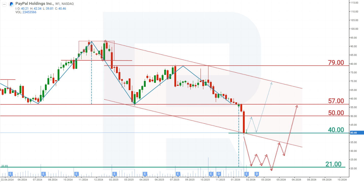 As of February 2026, PYPL shares are trading within a descending channel and have reached the lower boundary, which currently serves as support. However, a Head and Shoulders pattern has previously formed on the chart, signalling the risk of further downside. Against the backdrop of intensifying competition and subdued investor interest, the scenario of continued price weakness appears the most probable. Based on the current price dynamics of PayPal shares, the possible scenarios for 2026 are as follows: