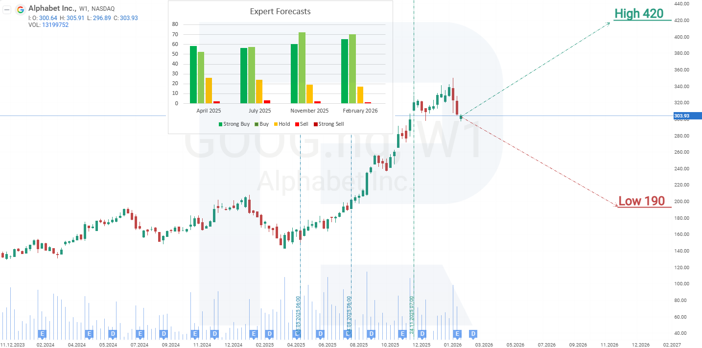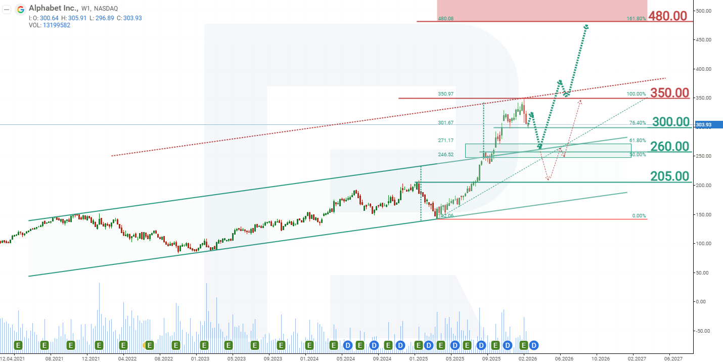 On the weekly chart, Alphabet shares reached the 350 USD resistance level in February 2026 and then moved lower. From April 2025 to February 2026, GOOG shares rose by 145% without significant corrections, increasing the likelihood of a price decline following a rejection at the 350 USD resistance level. The current decline can be viewed as a technical correction within the ongoing long-term uptrend. Based on the current performance of Alphabet Inc. shares, the potential price movements for 2026 are as follows: