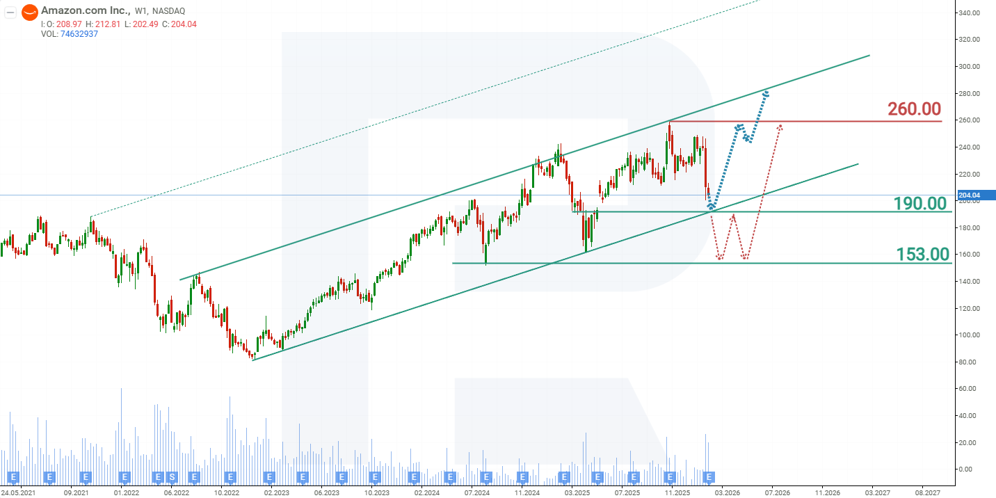 On the weekly chart, Amazon.com (AMZN) shares are trading within an ascending channel. Following the publication of the Q4 2025 report, the share price moved lower; however, this decline remains within the bounds of a correction inside the broader uptrend. The nearest support is at 190 USD, which also aligns with the ascending trendline, reinforcing this level as a key support area. Based on Amazon.com’s current stock performance, the possible scenarios for 2026 are as follows:
