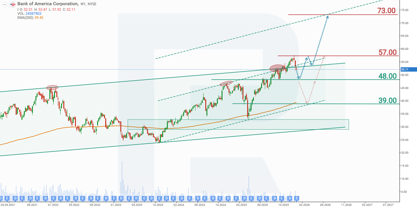 On the weekly chart, Bank of America shares are trading in an upward channel and have reached the upper boundary, which acts as resistance. The attempt to break through and hold above this level was unsuccessful, and even the quarterly report, which exceeded expectations, did not catalyse growth. This suggests the need for a correction before the upward trend can continue. Based on the current performance of BAC shares, the potential price scenarios for BAC in 2026 are as follows: