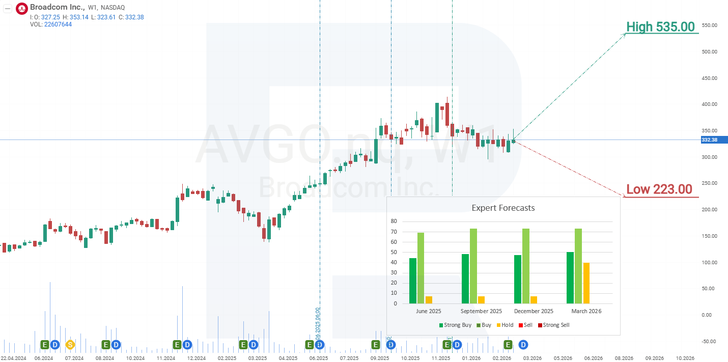 This article examines Broadcom Inc., outlining its revenue structure, reviewing its quarterly performance, and presenting expectations for 2026. It also includes a technical analysis of AVGO shares, which forms the basis for the Broadcom stock forecast for 2026.