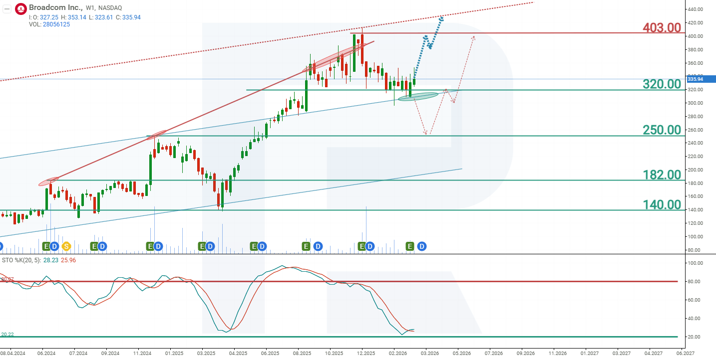 As of March 2026, the shares are trading near support at 320 USD. The Stochastic indicator is approaching the oversold zone, suggesting that the correction may be nearing completion. Notably, in April 2025, when the strong upward move began, the Stochastic indicator was at a similar level to its current reading, which may signal that the present correction is nearing its end. Based on the prevailing price dynamics in Broadcom shares, the potential price scenarios for AVGO in 2026 are as follows: