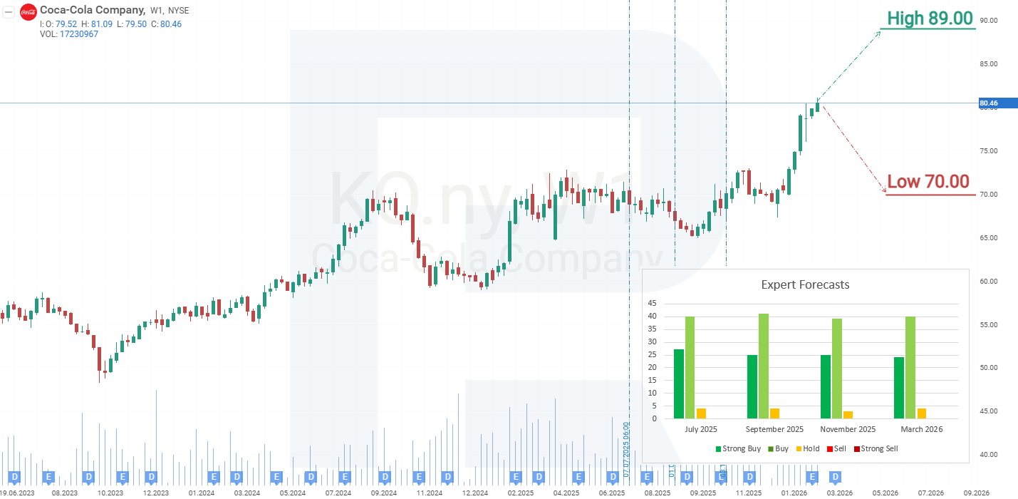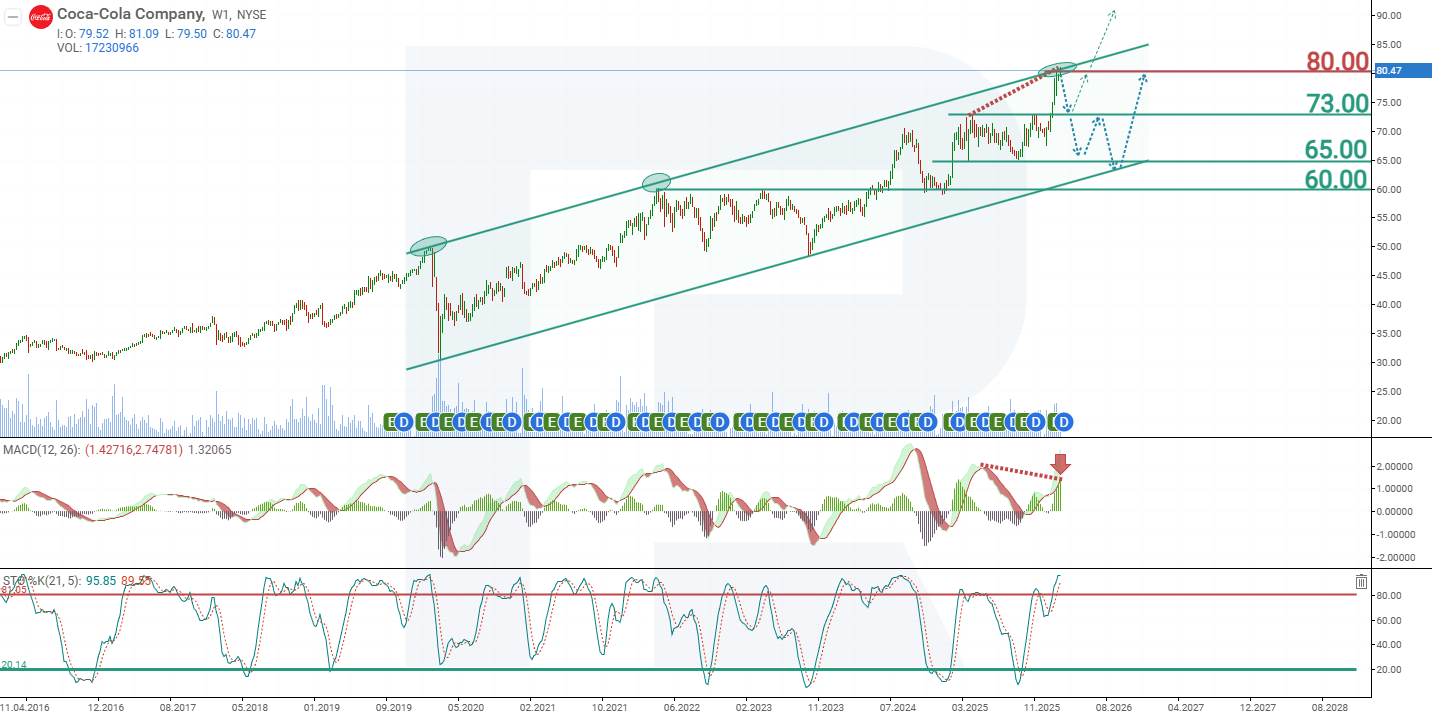 On the weekly chart, Coca-Cola shares are trading within an ascending channel and have approached the upper boundary, which now acts as resistance. A divergence has formed on the MACD indicator, and the Stochastic is in the overbought zone (above 80), signalling a weakening of the upward momentum. Together, these indicators suggest a potential decline in the share price. Based on the current performance of The Coca-Cola Company shares, the potential movements in KO stock in 2026 are as follows: