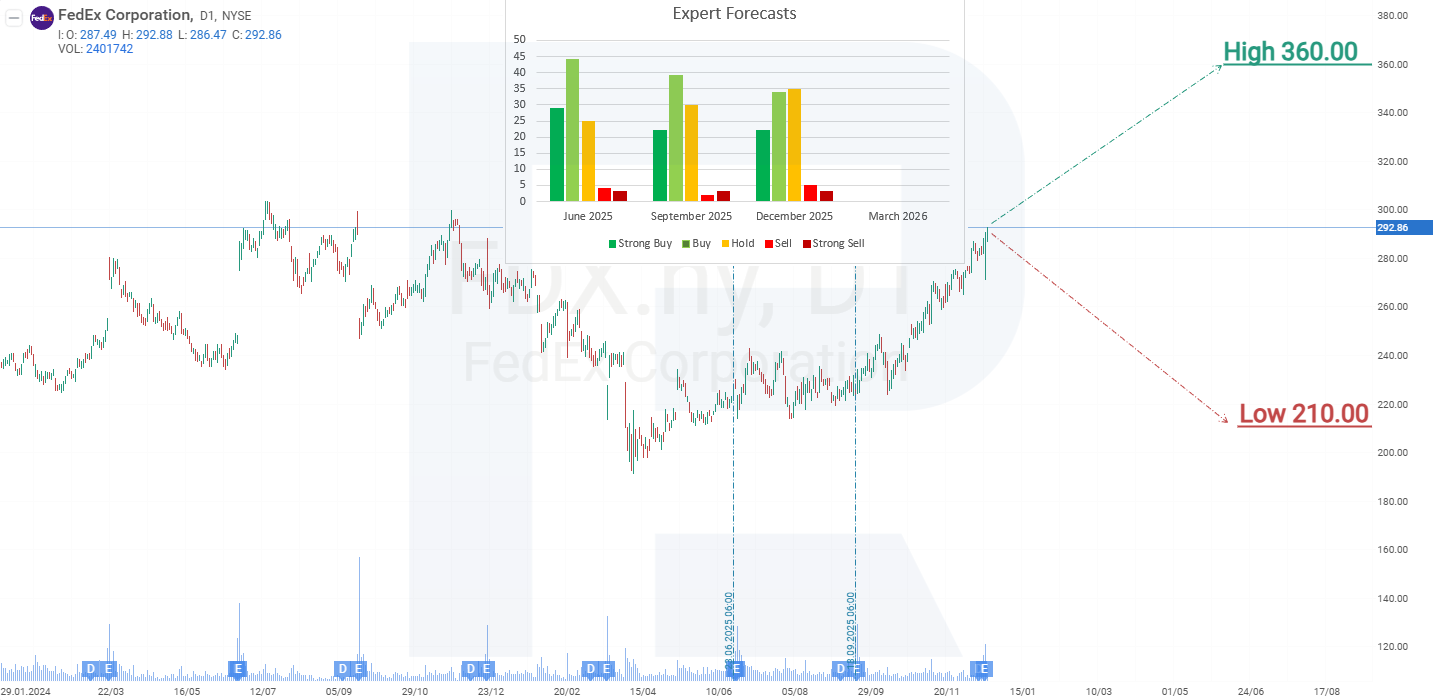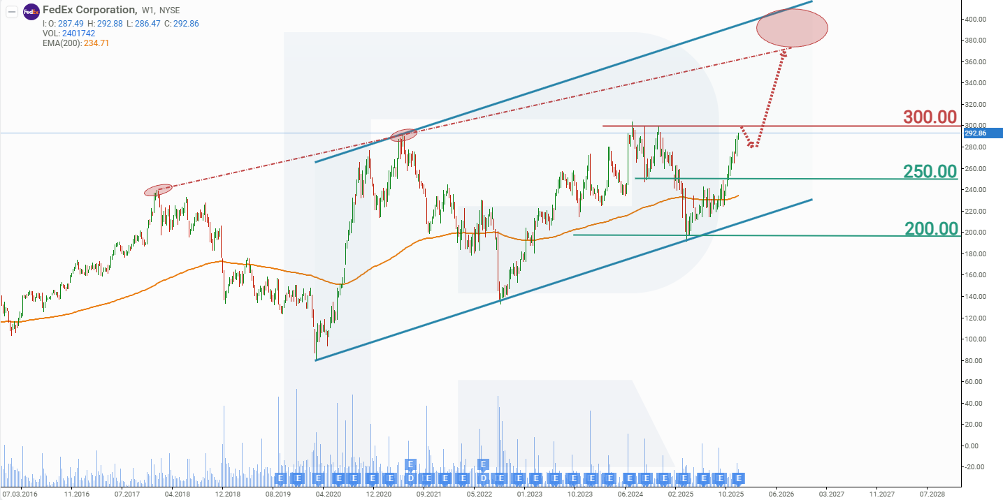 FedEx shares are trading within an ascending channel. In November 2024, after reaching a peak at the 300 USD level, FDX quotes began to decline within a correction that lasted until April 2025. During this period, the stock price fell by approximately 35% – down to 190 USD. After the publication of the Q3 2025 fiscal year report, the situation with FedEx shares began to improve, and the quotes reversed upwards. Subsequently, driven by quarterly reports, FDX shares continued to rise and by December 2025 had once again approached resistance at 300 USD, fully recovering the drop that began in November 2024.