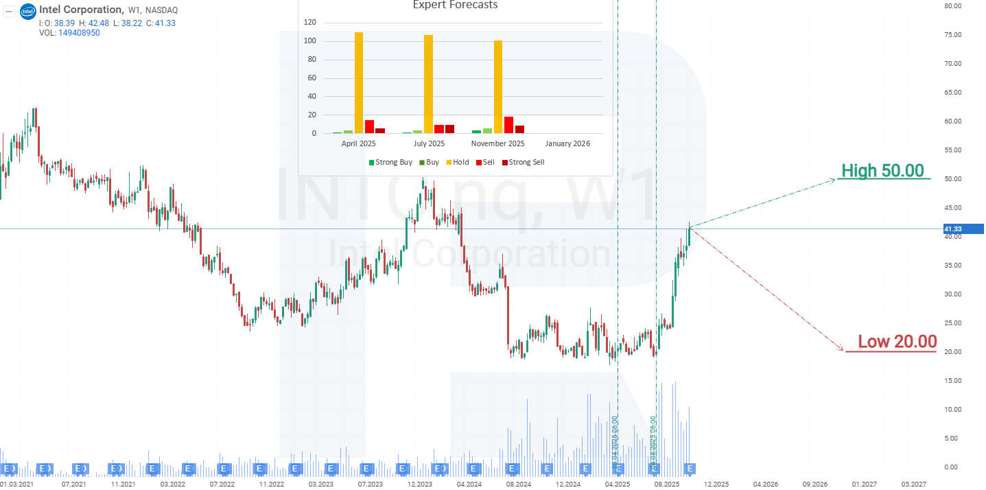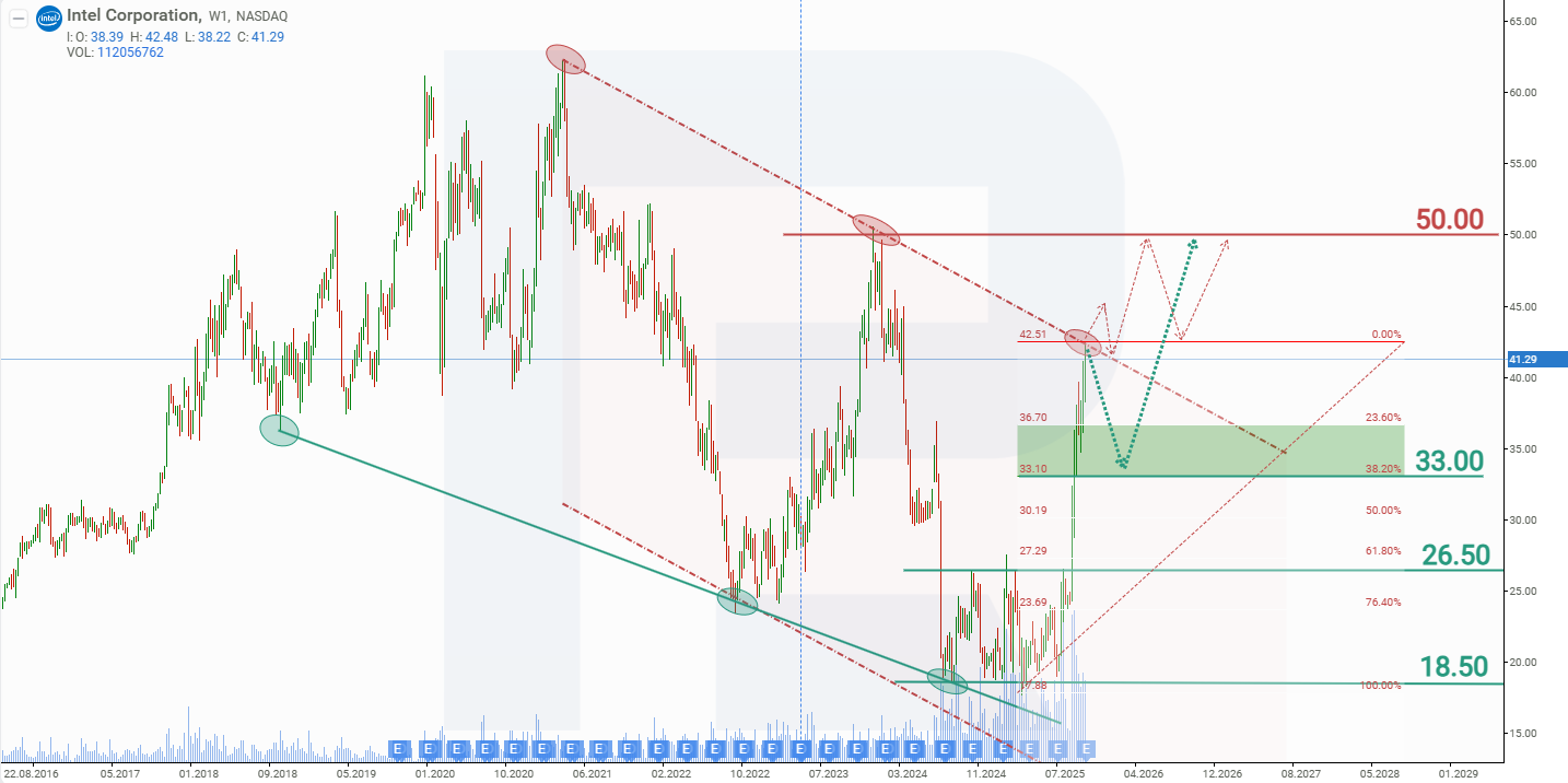On the weekly chart, Intel’s shares continue to trade within a downward channel. Following the release of the Q2 2025 report, Intel stock gained strong upward momentum, rising by 120% between August and November 2025 without any significant corrections. Currently, the share price is testing the trendline, which serves as resistance. Based on the current performance of Intel’s share price, the possible scenarios for 2025 are as follows:
