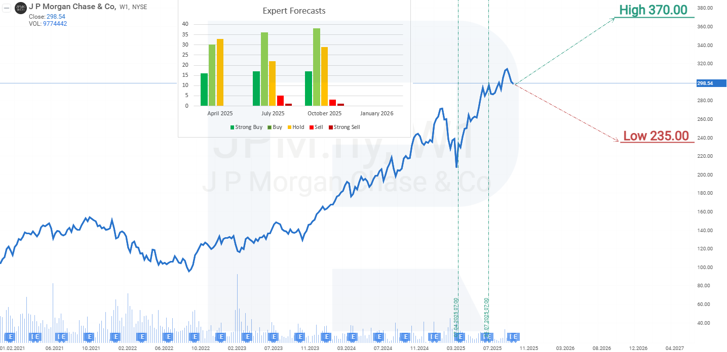 • Stock Analysis: 3 out of 14 experts rated JPMorgan Chase & Co. shares as a Strong Buy, 7 as Buy, and 4 as Hold. The upper-end forecast reaches 350 USD, with the lower bound at 285 USD.