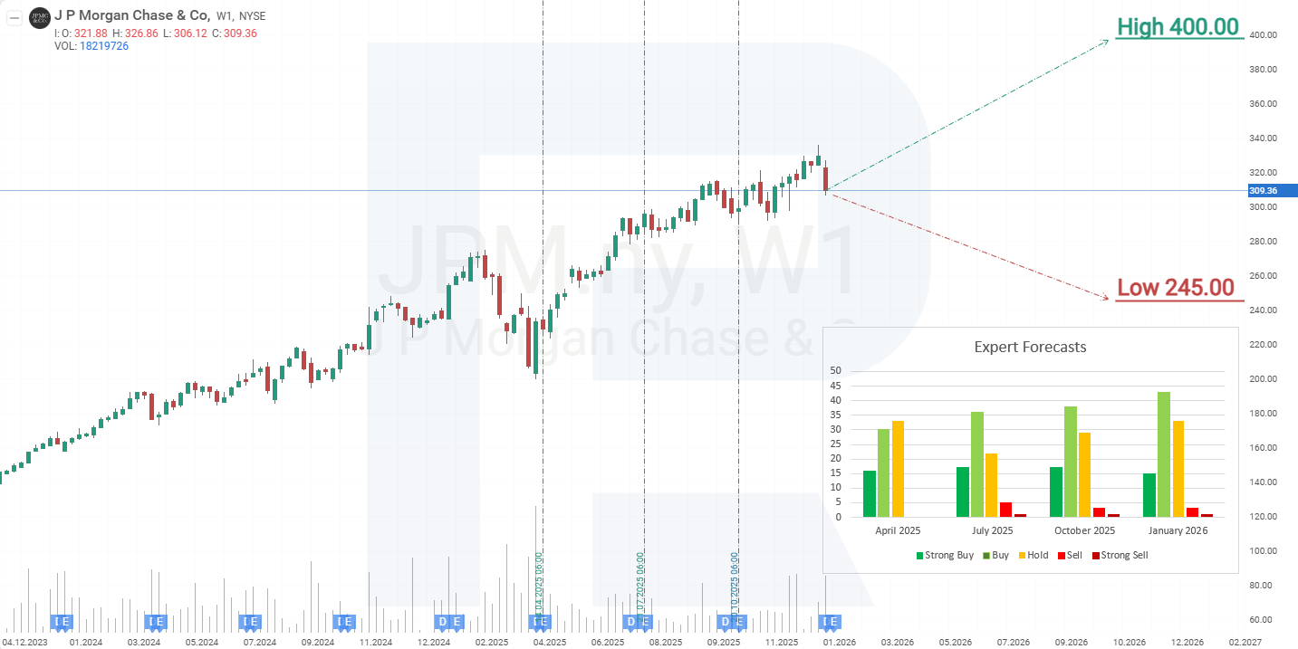 This article provides an overview of JPMorgan Chase & Co., presents a fundamental analysis of JPM stock, and outlines key metrics from the Q3 and Q4 2024 reports, as well as Q1, Q2, Q3, and Q4 2025, enabling a comparison of the bank's financial performance across different periods. Additionally, based on the recent performance of JPMorgan Chase & Co.'s shares, a technical analysis of JPM is provided, from which a stock forecast for JPMorgan Chase & Co. for 2026 is developed.