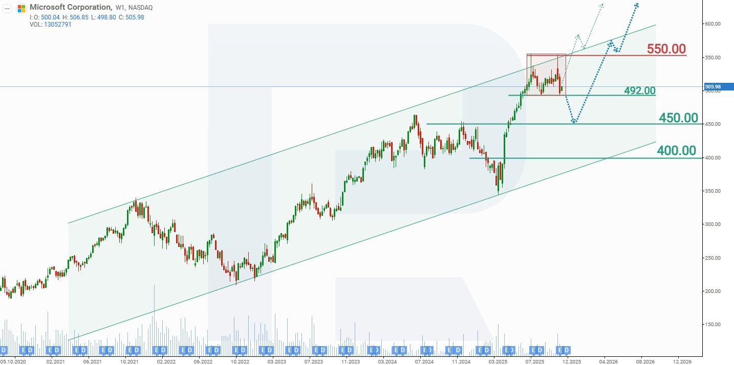 Expert forecasts for MSFT stock for 2025On the weekly chart, Microsoft Corporation shares are trading within an upward channel and have reached the upper boundary, which serves as resistance for the price. Following the publication of the Q1 FY 2026 report, MSFT shares moved lower, forming a Double Top pattern on the chart, which signals a potential further decline in the share price. Based on the current performance of Microsoft Corporation shares, the possible scenarios for 2025 are as follows: