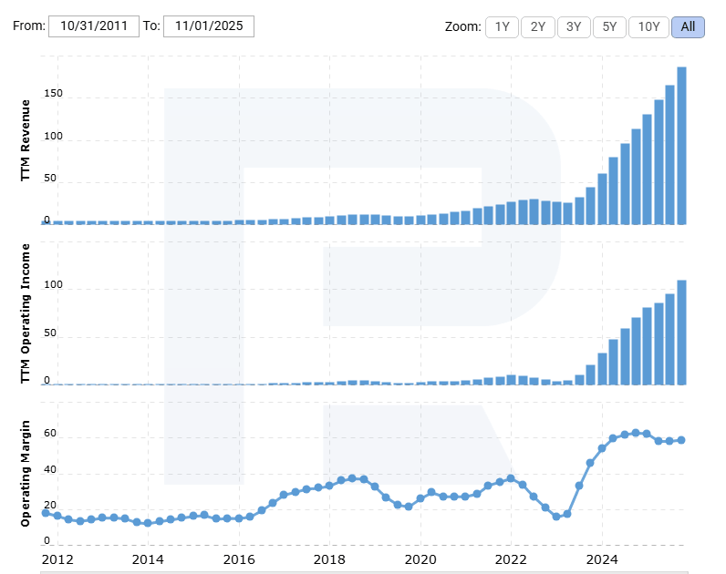 A fundamental analysis of NVIDIA’s report showed that revenue increased across all segments. The Data Center segment, which focuses on AI technologies, remained the leader. The company’s operating margin chart below illustrates the extent to which AI has influenced NVIDIA’s performance.