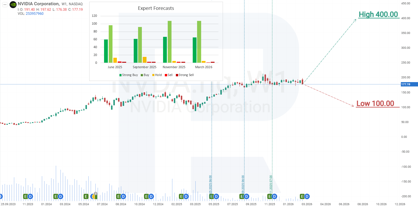 Since October 2025, NVDA’s share price has stalled, with even strong quarterly results failing to reverse this trend. The stock is trading near its historical high, and many market participants are awaiting a correction, despite the positive outlook from management. However, key support for the stock remains the buyback program and robust cash flow generation. The company is actively directing free cash flow toward buybacks, which helps limit the risk of a sharp decline. Based on the current performance of NVIDIA shares, the expected price movements for 2026 are as follows: