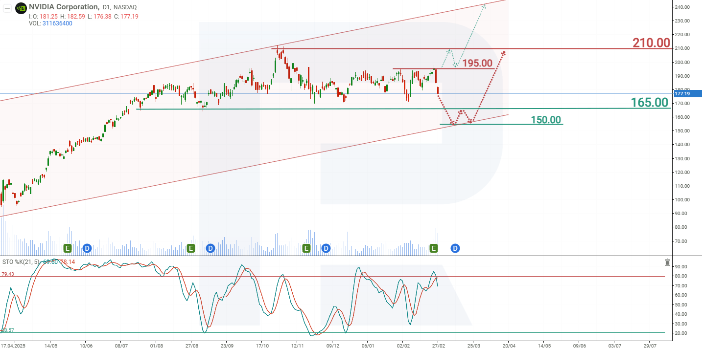 The primary forecast for NVIDIA shares suggests a decline within the correction, with support at 150 USD. A rebound from this level would signal the end of the correction and the resumption of price growth within the uptrend. The upward target for NVDA shares would be the resistance level at 240 USD.