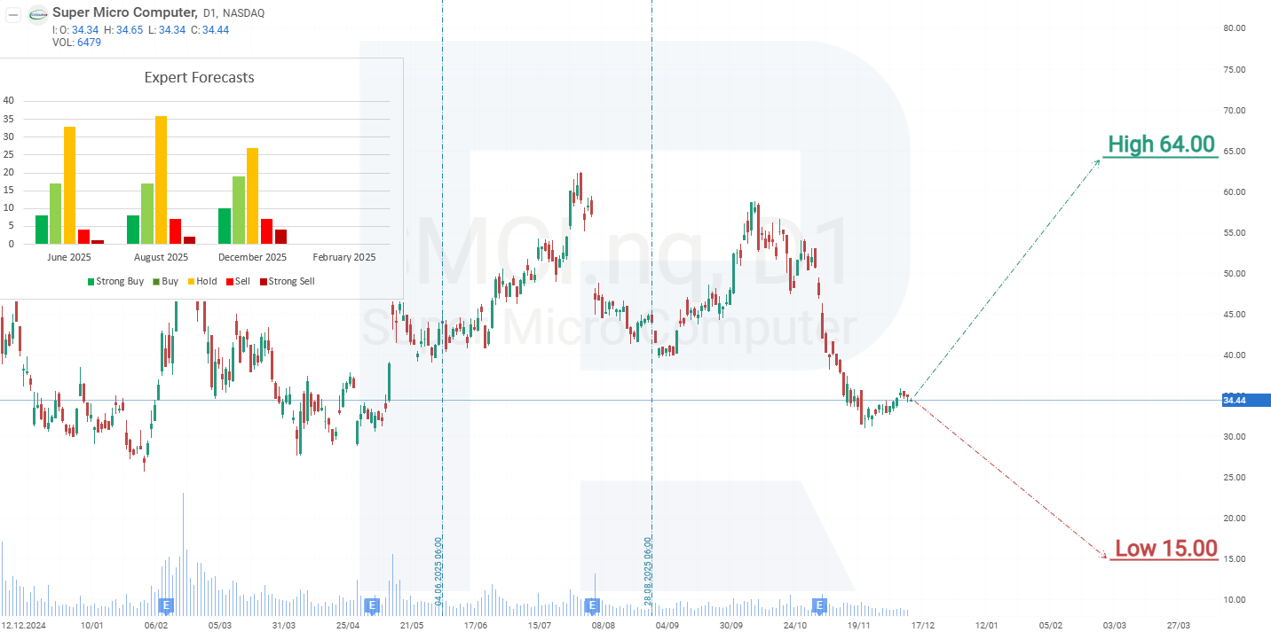 The base-case forecast for Super Micro Computer shares assumes a test of support at 27 USD, followed by a rebound towards 66 USD.