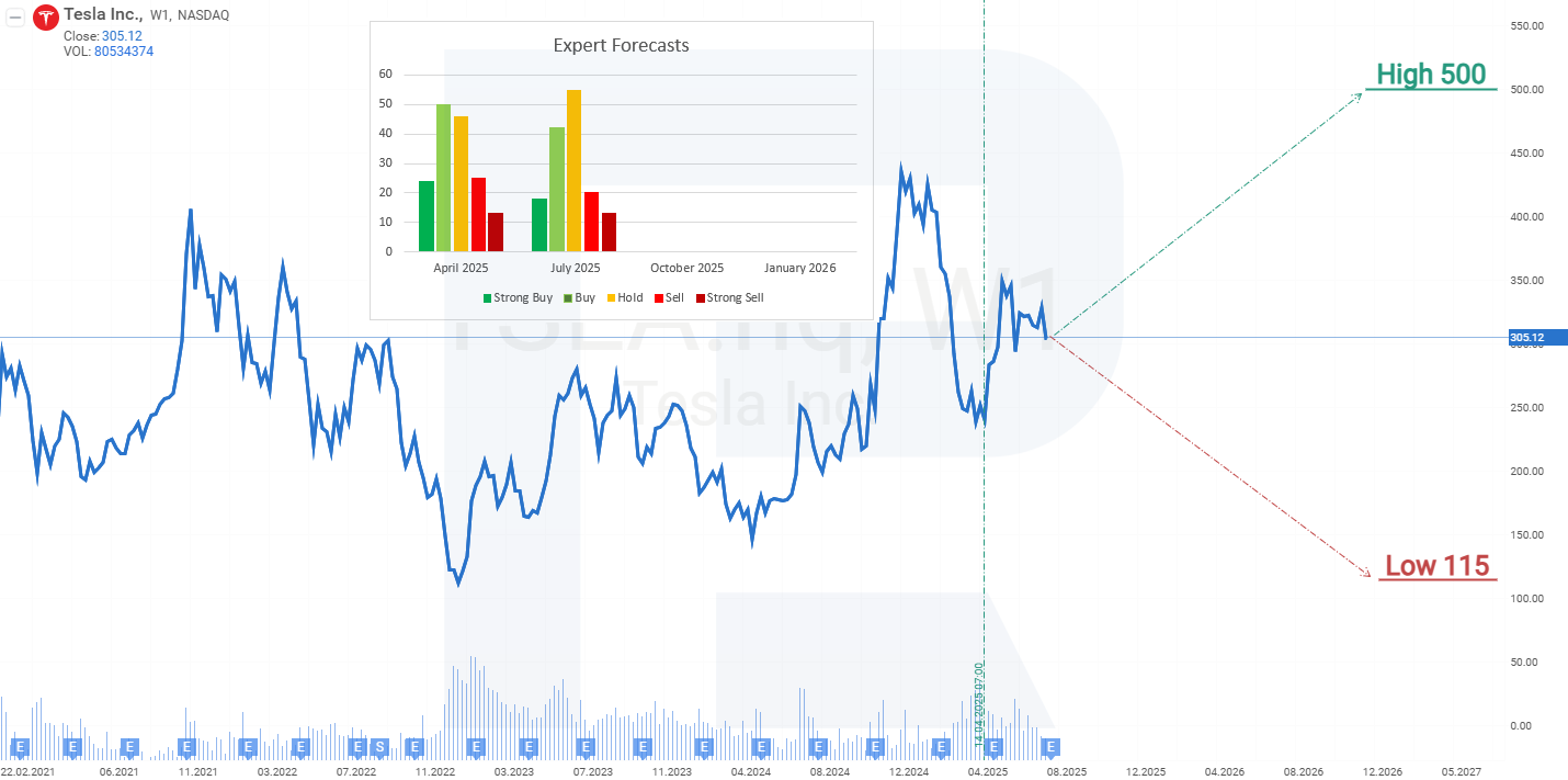 Musk’s return to active leadership of the company reignited investor optimism, with Tesla shares rising by 67% between April and May 2025. However, Musk once again found himself at the centre of political controversy – this time clashing with the Trump administration. This led to a public dispute on social media and, subsequently, to the administration’s decision to cut subsidies for electric vehicles in the US. Given that around 37% of Tesla’s Q2 2025 profit came from the sale of regulatory credits, this could significantly affect the company’s financial performance. As a result, investor caution remains, reflected in TSLA’s consolidation within the 290–370 USD range. Based on the current performance of Tesla shares, the possible price scenarios for 2025 are as follows: