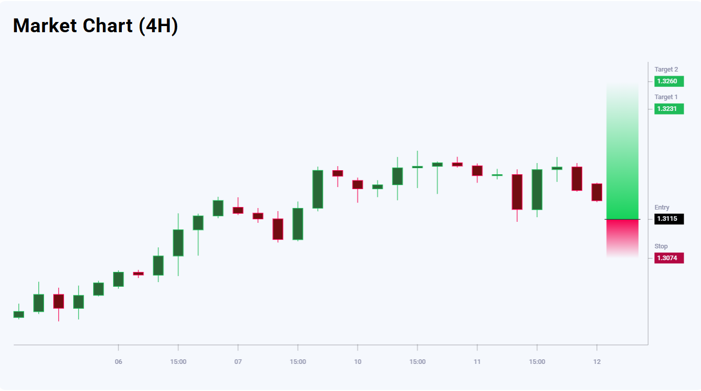 Market sentiment for GBPUSD shows a bullish bias – 53% vs 47%. The risk-to-reward ratio exceeds 1:3. Potential profit is 116 pips at the first take-profit target and 145 pips at the second, with possible losses limited to 41 pips.