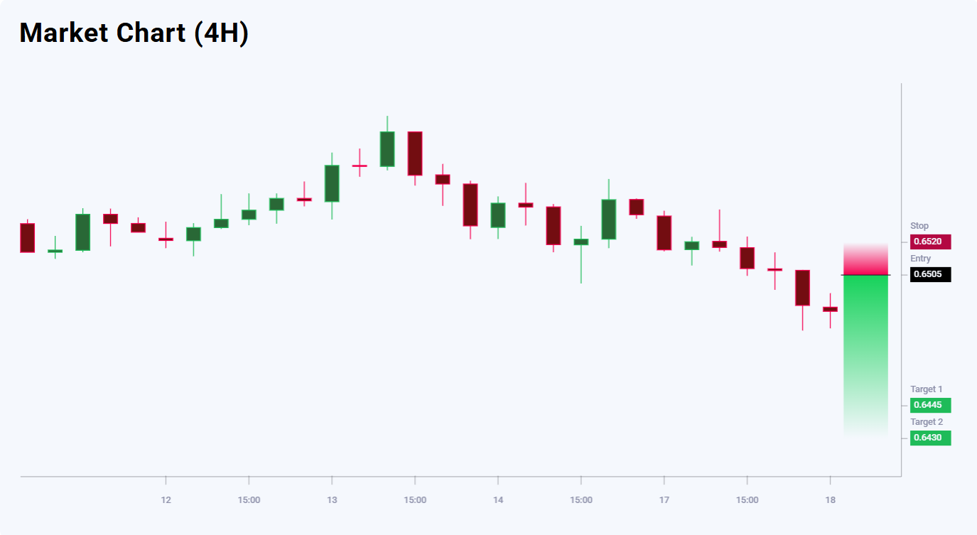 Market sentiment for AUDUSD shows a bearish bias – 64% vs 36%. The risk-to-reward ratio is 1:5. Potential profit is 60 pips at the first take-profit target and 75 pips at the second, with possible losses limited to 15 pips.