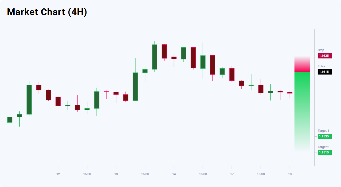 Market sentiment for EURUSD shows a bearish bias – 62% vs 38%. The risk-to-reward ratio is 1:5. Potential profit is 80 pips at the first take-profit target and 100 pips at the second, while possible losses are limited to 20 pips.