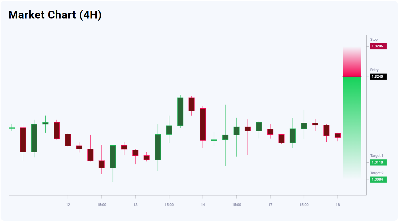 Market sentiment for GBPUSD shows a bearish bias – 75% vs 25%. The risk-to-reward ratio exceeds 1:3. Potential profit is 130 pips at the first take-profit target and 156 pips at the second, with possible losses capped at 46 pips.