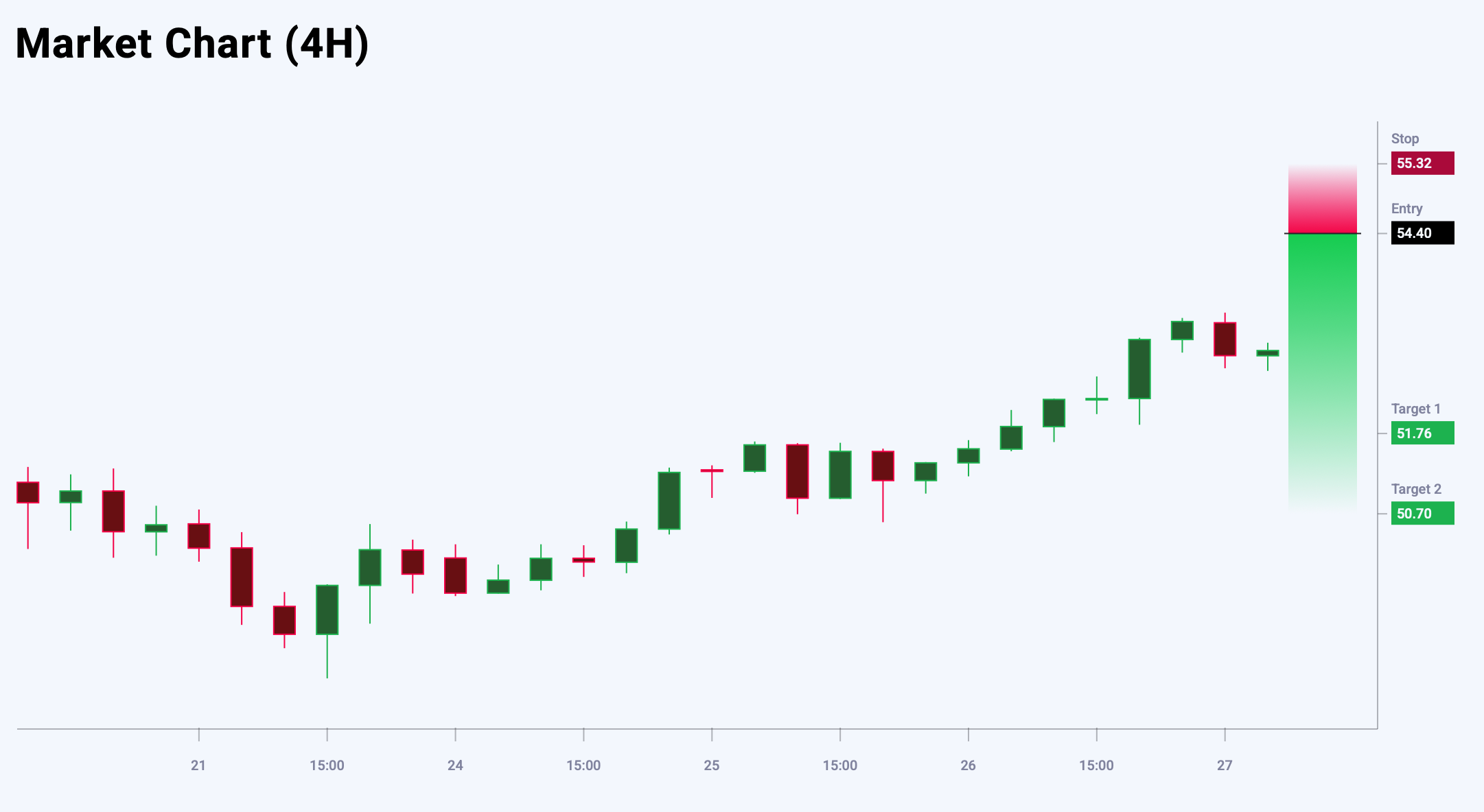 Bulls continue to control the XAGUSD market, but slowing upward momentum signals a potential reversal. This puts pressure on short-term sentiment, therefore selling opportunities with favourable risk-to-reward setups are recommended. The key resistance level is located at 54.40. Today’s XAGUSD trade idea suggests placing a pending Sell Limit order.